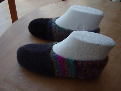 Ab und an schaffe ich es schon,auch mal was für mich selber zu machen. Und die gefilzten Puschen waren dringend nötig, durch meine alten hat es schon durch die Sohle gezogen!Die unterschiedliche Frbgebung liegt daran, dass ich bei meinen eigenen Filzpuschen immer Resteverwertung mache, und diese Farben waren halt grad da!